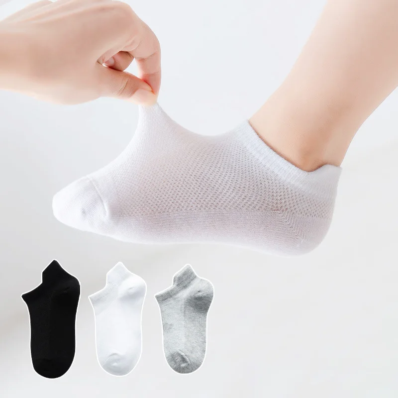 Keep your child comfortable and cool with these kids ankle socks, designed for everyday wear in spring and summer. Made from soft cotton with breathable mesh fabric, they provide excellent airflow to keep little feet dry and fresh. The lightweight and thin design ensures comfort during warm weather without overheating. Suitable for boys and girls aged 1–12 years, these socks offer a flexible and comfortable fit. The elastic cuff keeps the socks securely in place without being too tight on the skin. Available in classic solid colors like black, white, and grey, they easily match any outfit. Perfect for school, playtime, or casual outings, they combine practicality with comfort. The durable construction ensures long-lasting wear even with frequent use. Designed to be gentle on sensitive skin, they reduce irritation and discomfort. Easy to wash and maintain, they retain their softness and shape over time. Ideal for pairing with sneakers, sandals, or casual shoes, they are versatile for daily use. These socks also make a practical gift for parents and children alike. Lightweight and compact, they are great for travel or on-the-go needs. Provide your child with comfort, breathability, and style with this set of cotton ankle socks.